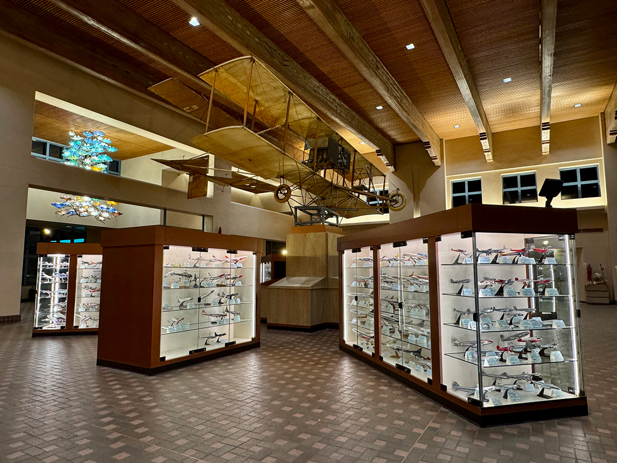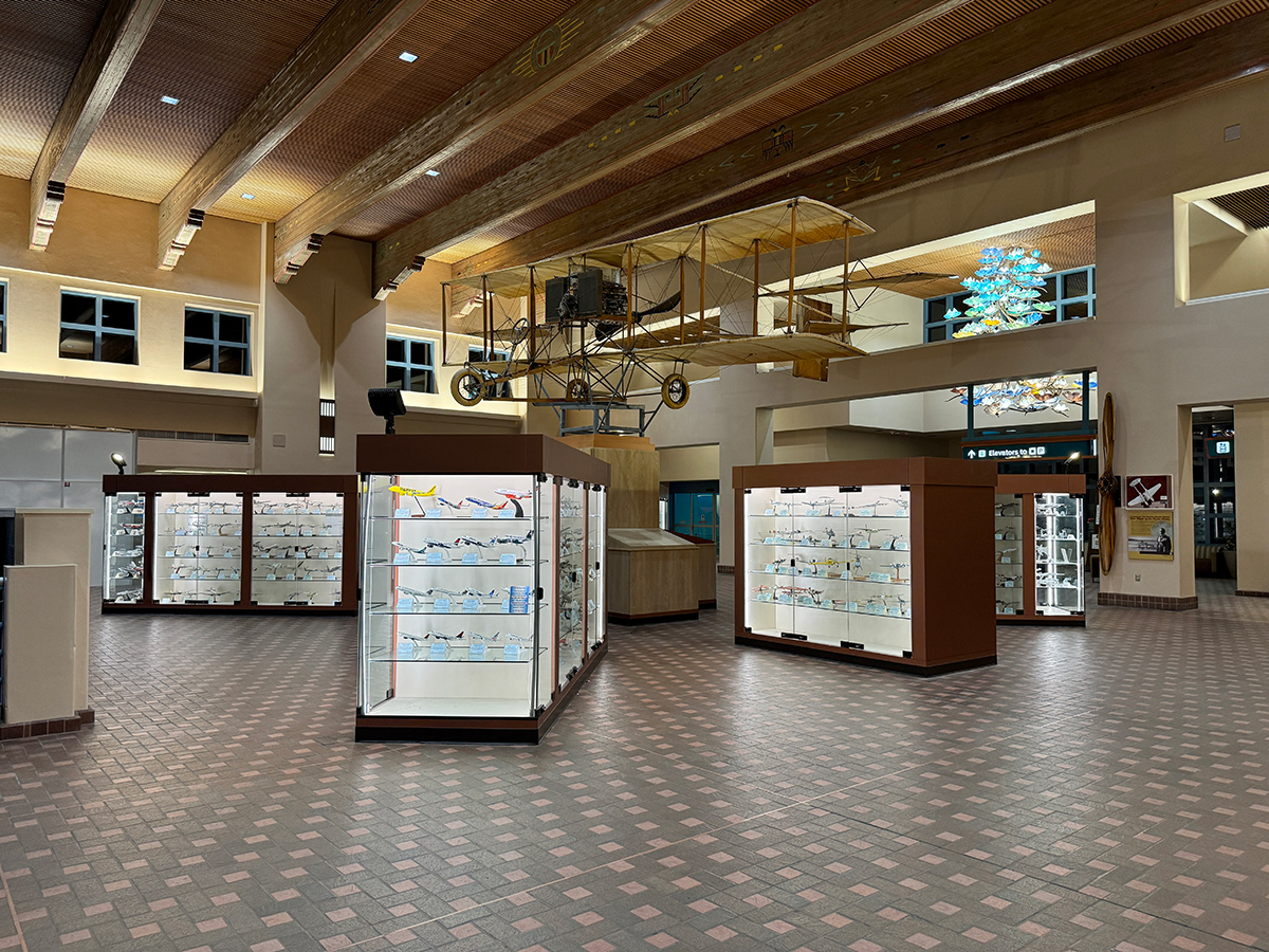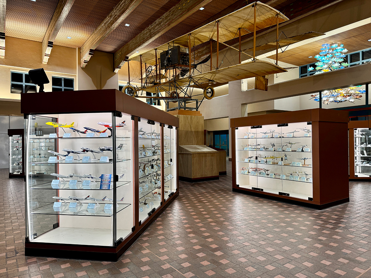 The Albuquerque Sunport has relocated the Cavalcade of Wings Aviation History Museum to accommodate the ongoing “Dream of Flight” construction project. Here are some photos of the new design showing display cases located in the Great Hall underneath the existing Ingram-Foster Biplane display.