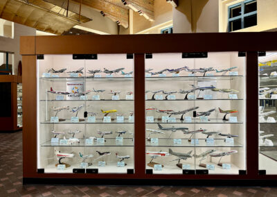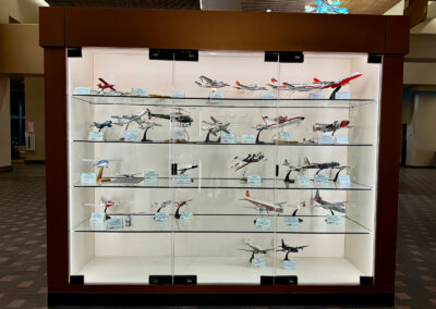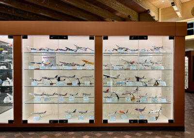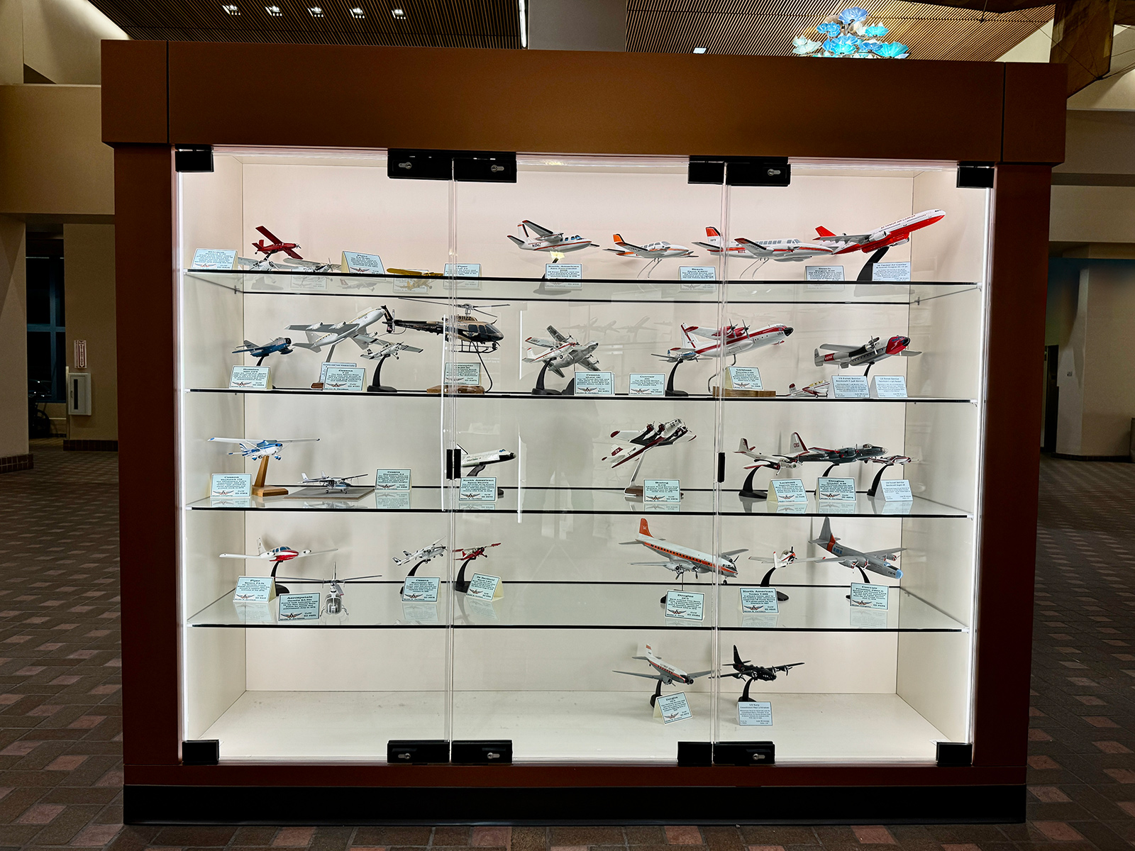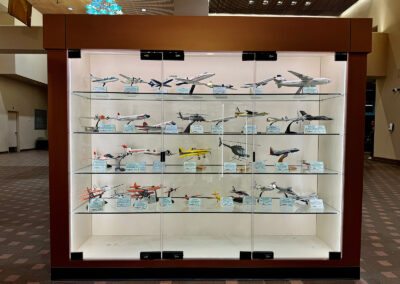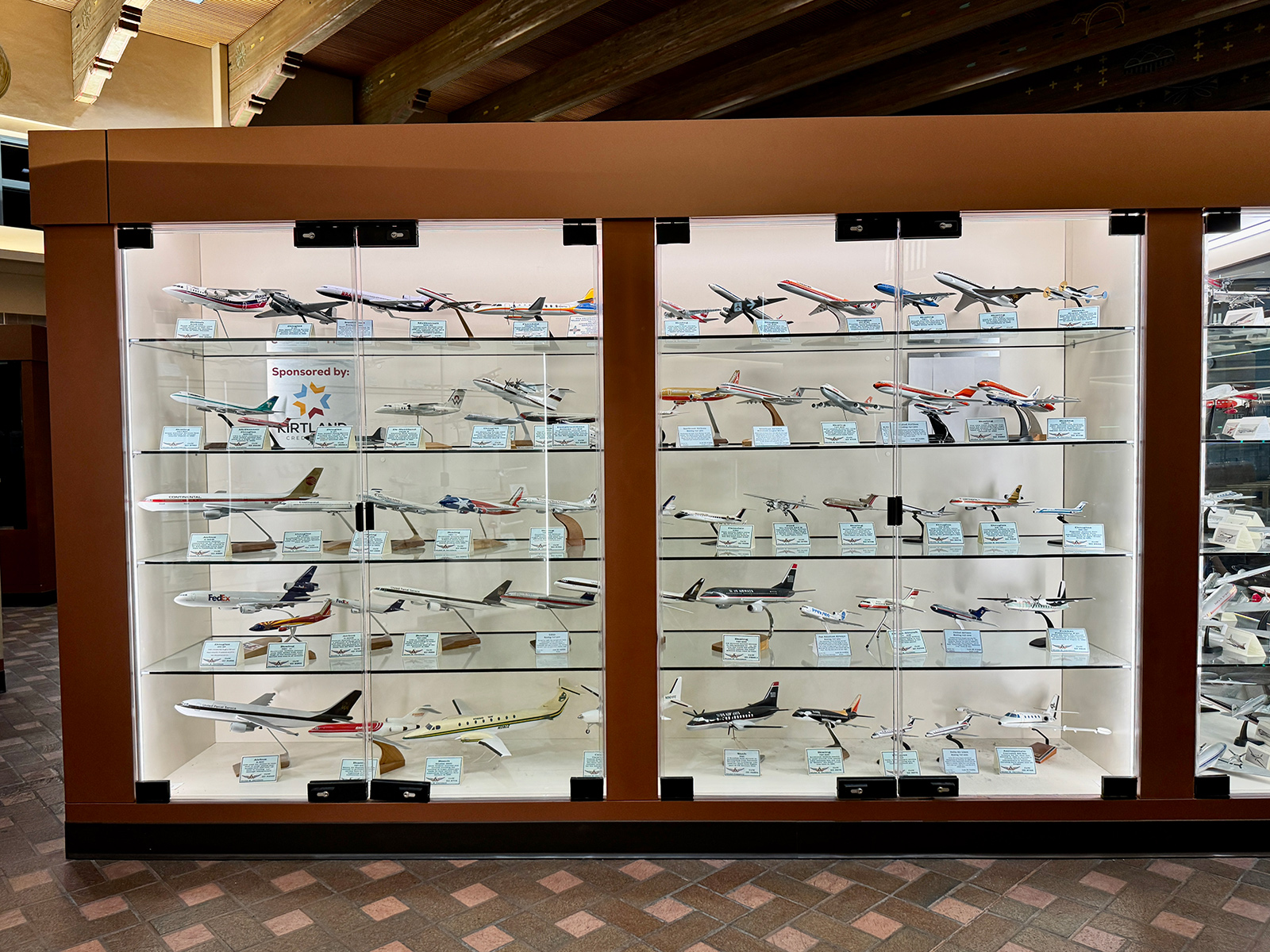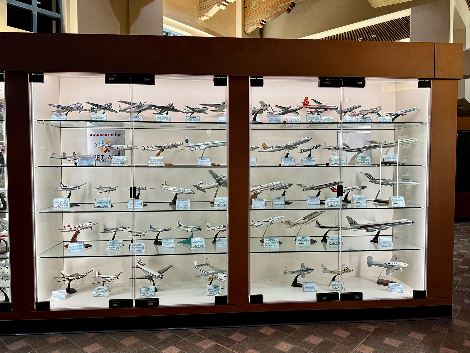 The collection has gone from one display case with 25 airplane models to a collection that represents almost all commercial, military, government, and private aircraft that have directly contributed to New Mexico’s aviation history. Each aircraft model is crafted to look like the actual plane to land in Albuquerque and in most cases is documented with a photograph of the plane sitting here on the ground. The collection includes all commercial airlines from the first TAT and Western Air Express to every airline currently servicing the Sunport. Most of the commercial aircraft models were donated by the actual airline when they serviced Albuquerque.