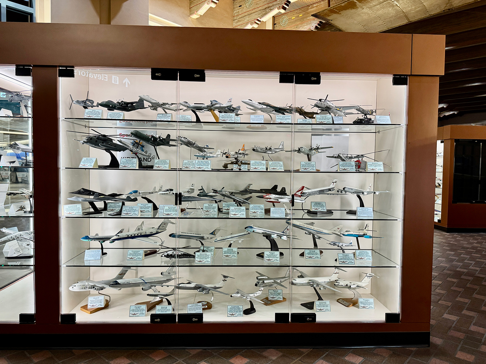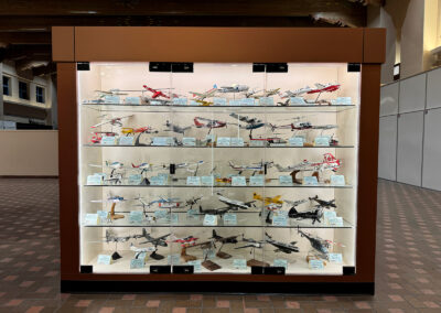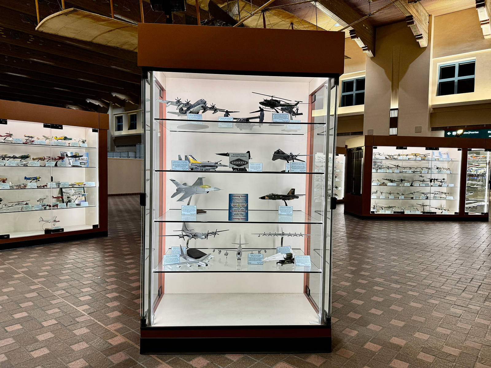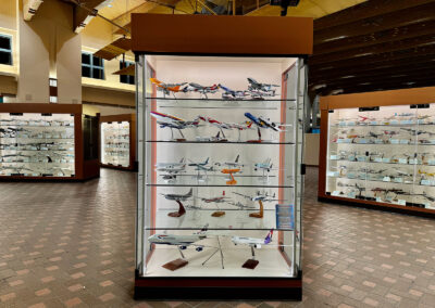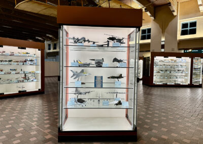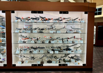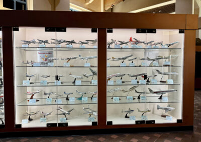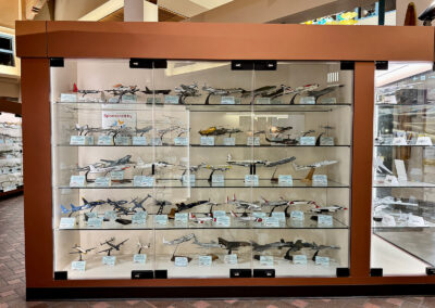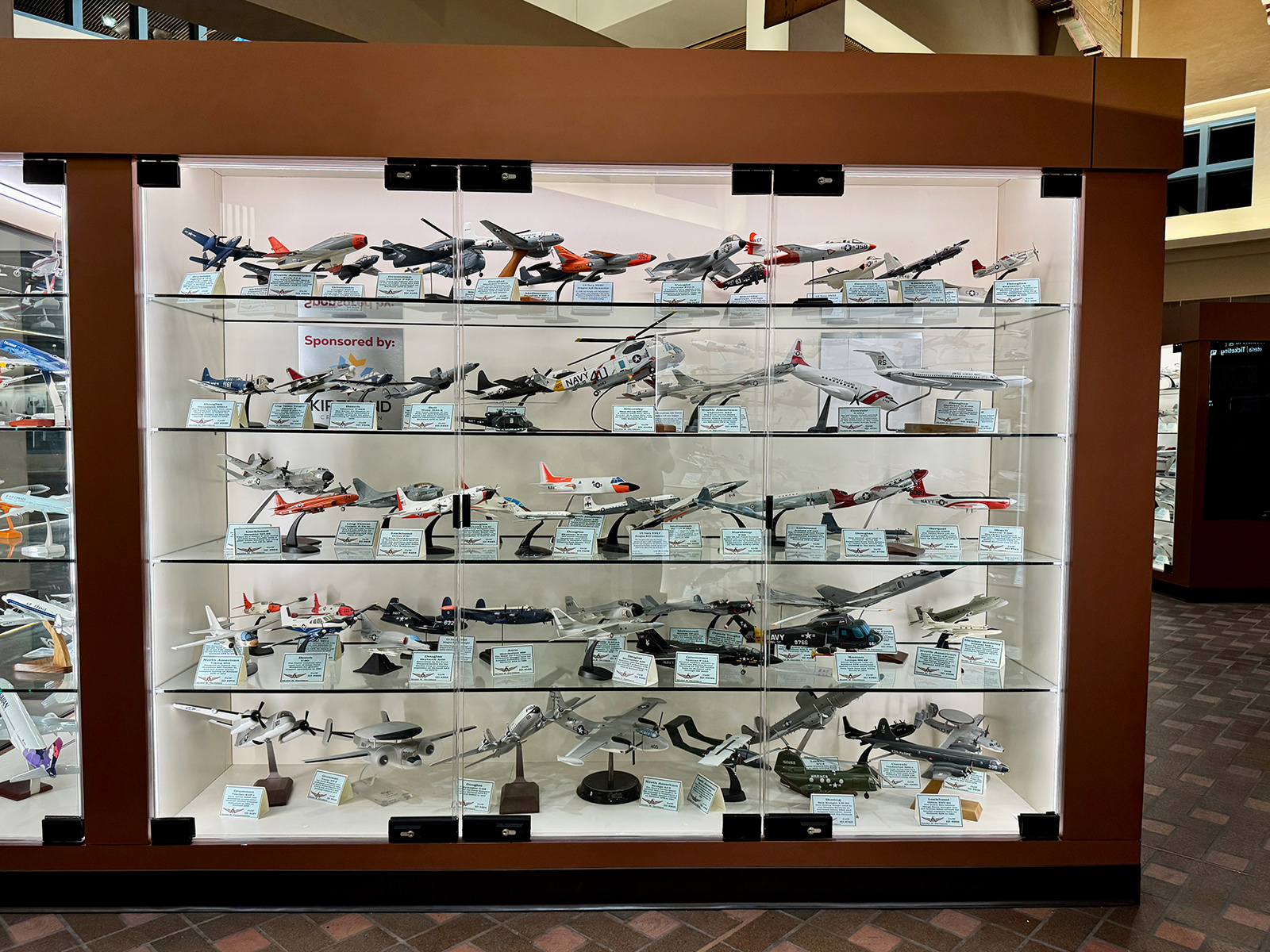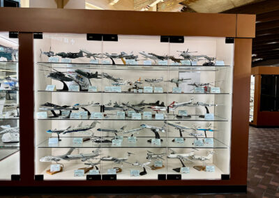 The military aircraft models were mostly built and donated by members of the Albuquerque Scale Modelers club over the years and include aircraft for the US Air Force and the US Navy that were assigned to adjacent Kirtland Air Force Base. The large contingent of Navy planes assigned to Kirtland for testing over several decades became affectionately known as the “Rio Grande Navy”.