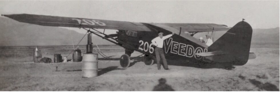 Pilot’s George Haldeman and Shirley J. Short, Harmon Trophy winners, flew a Bellanca J CH-300 across the country with Veedol # 206 painted on the side. The aircraft came through Albuquerque on September 13, 1928, while competing in the National Air Race.