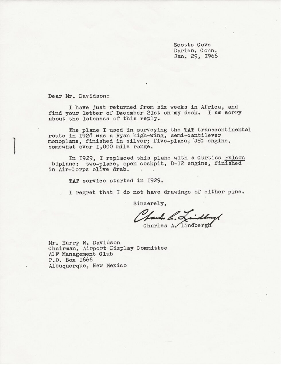 Below, along with photos of the aircraft, is a letter written by Charles Lindbergh to Mr. Harry Davidson, founder of Cavalcade of Wings, confirming the use of this plane and some of the aircrafts design characteristics.