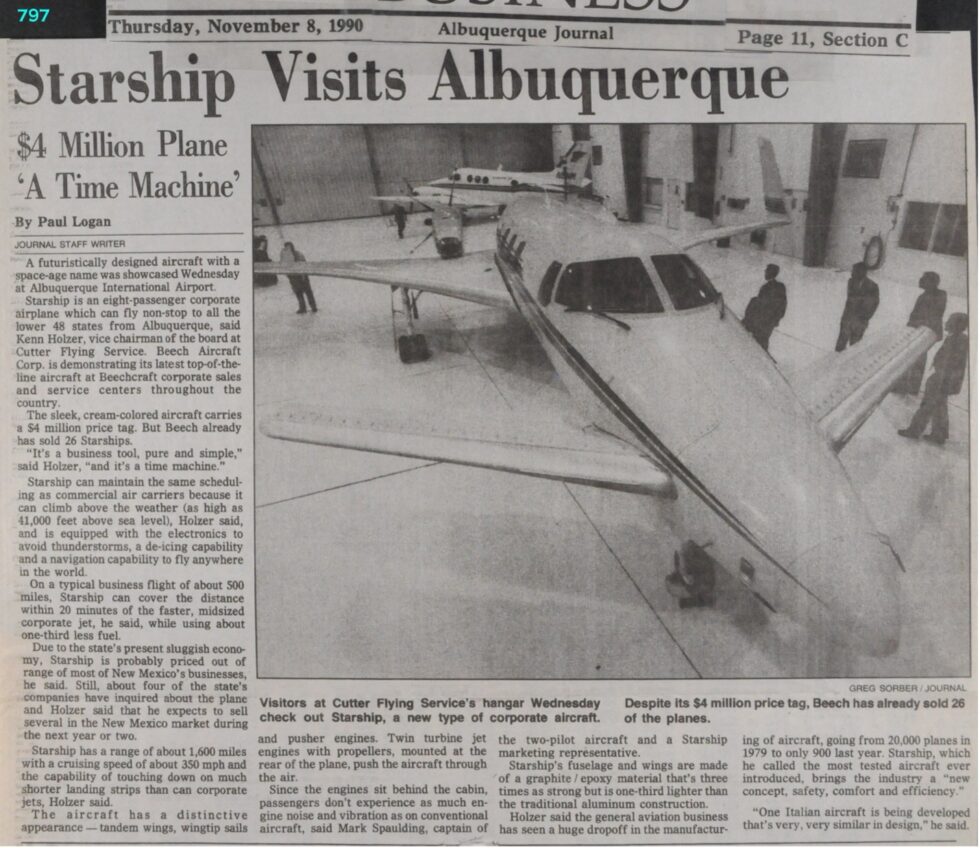 Cutter was Albuquerque’s Beechcraft distributor and they only sold two Starship aircraft out of Albuquerque and neither one was based locally after the sale. Starship, N-2000J, was one of the aircraft here in January of 1987.