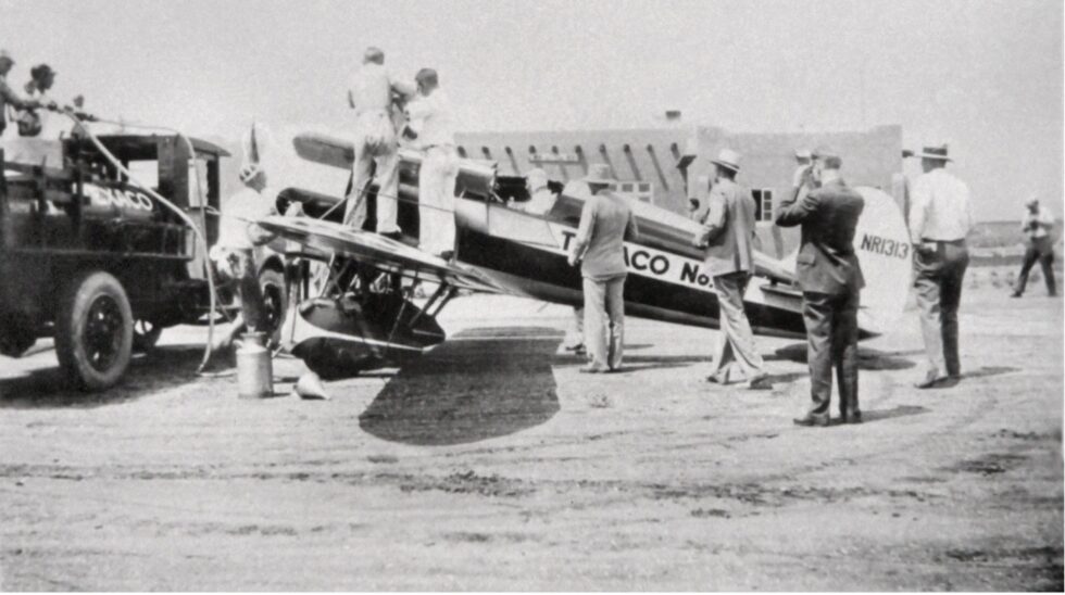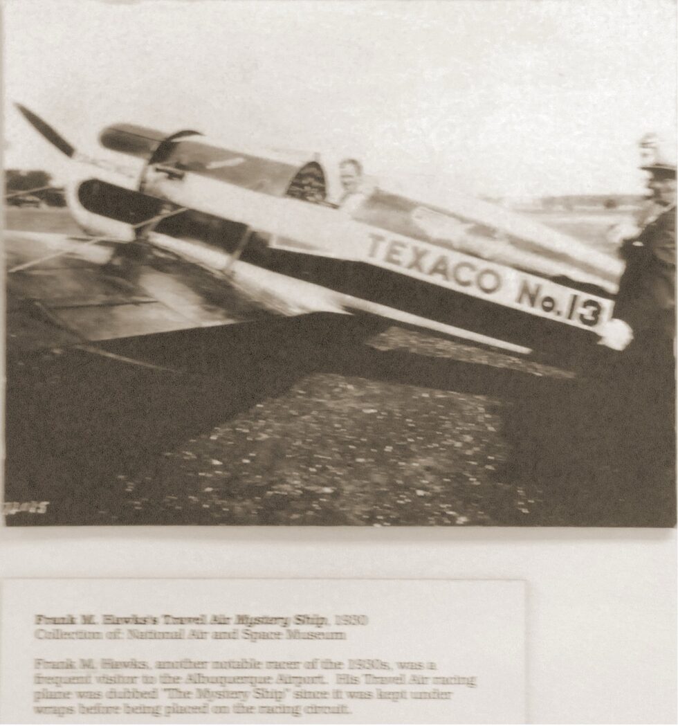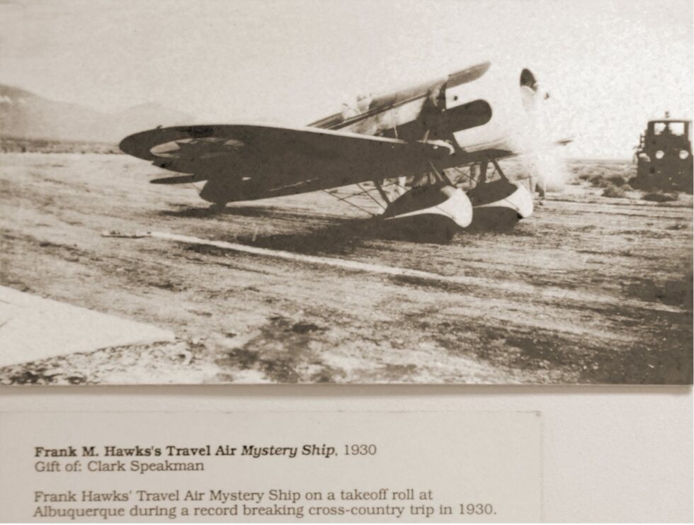 In 1930, Hawks embarked on a series of exhibition flights and record-breaking flights across the United States including a new transcontinental west-to-east record on August 13, 1930 which included a refueling stop in Albuquerque. Frank Hawks and the Mystery Ship was also a frequent transient visitor to the Albuquerque Airport beginning throughout the 1930’s.