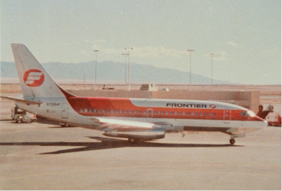 Frontier Airlines flew this Boeing 737-200 N-7377F to the Albuquerque Sunport with a new livery that was updated in May of 1978. This was just one of the several liveries that Frontier would use throughout their history.