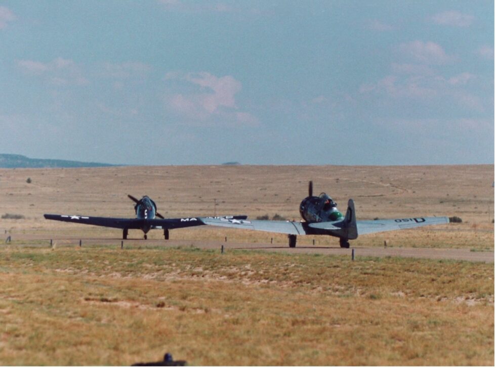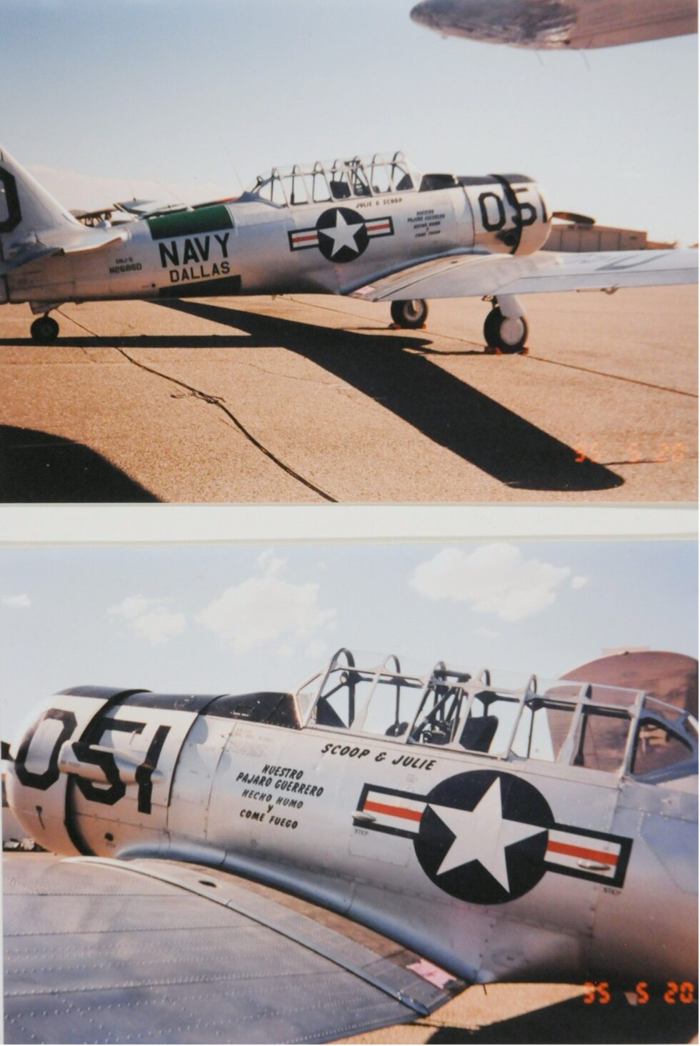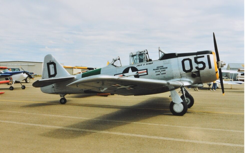 Scoop Smith and his wife Julie owned two versions of the Texan. One was AT-6 the other was a SNJ-5. Their hanger at Coronado Airport in Albuquerque was favorite hangout for local private pilots. Scoop’s aircraft number N-2686-D was sliver in color while Julie’s SNJ-5 was finished in Navy blue. She flew the Pitts (CoW#712) in two world aerobatic competitions. Minor A.”Scoop” Smith died from injuries suffered in a plane crash in Raton, New Mexico on August 24, 2001 while practicing for an upcoming air show.