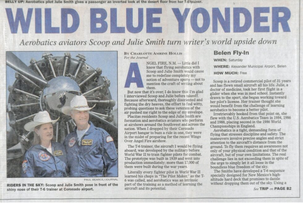 Albuquerque resident, Dr. Julia Pfile Smith, one of the United States best women stunt pilots, flew this Pitts Special S-1, N30JP, aircraft at exhibitions and air shows all over New Mexico beginning in 1983. She was a member of the US Women’s acrobatic team that competed in world competition during the summer of 1984. Her team won second place in 1985. Julie and her husband Minor “Scoop” Smith purchased two North American SNJs and performed together for several years.