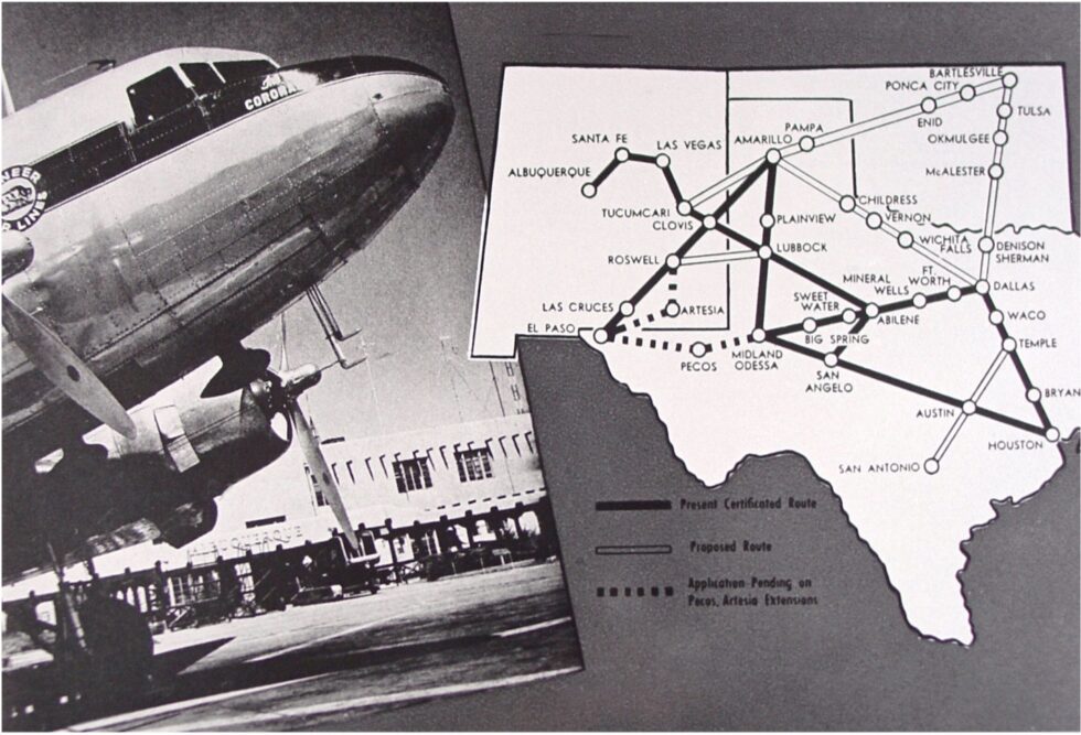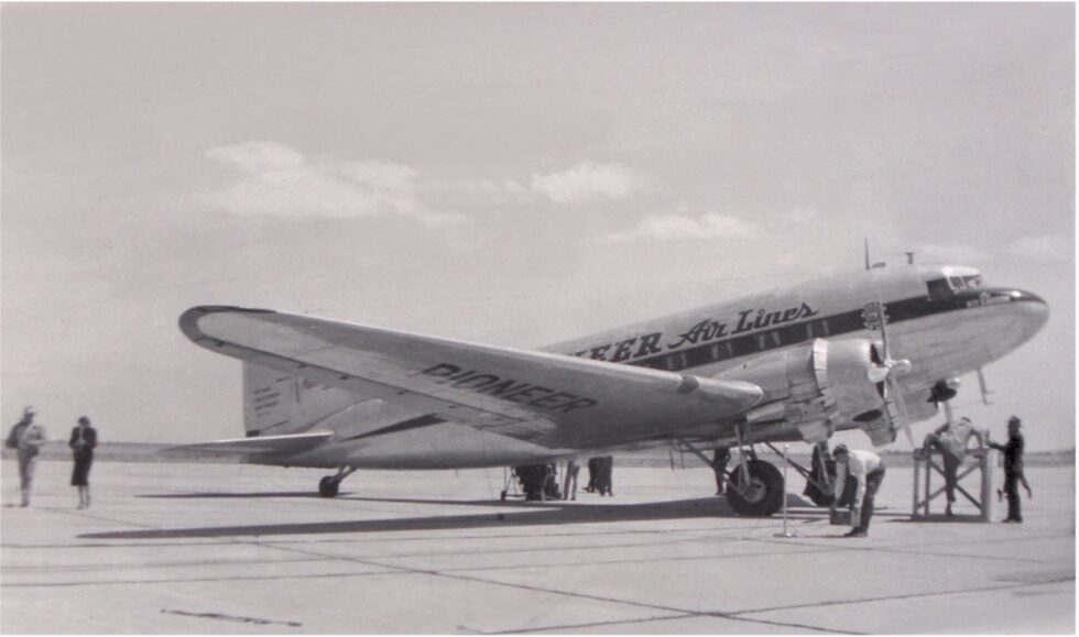 In 1948, Pioneer Air Lines began service between Albuquerque and Dallas, Texas with stops in several other New Mexico and Texas cities using the Douglas DC-3. This model is shown with the first livery of the short lived airline. For a period in 1952 through 1953, Pioneer upgraded their fleet with Martin 202 aircraft however the larger aircaft proved to be too costly forcing Pioneer to revert back to using DC-3’s. Service continued on the route through eastern New Mexico and west Texas until Pioneer was purchased by Continental Airlines in 1955.