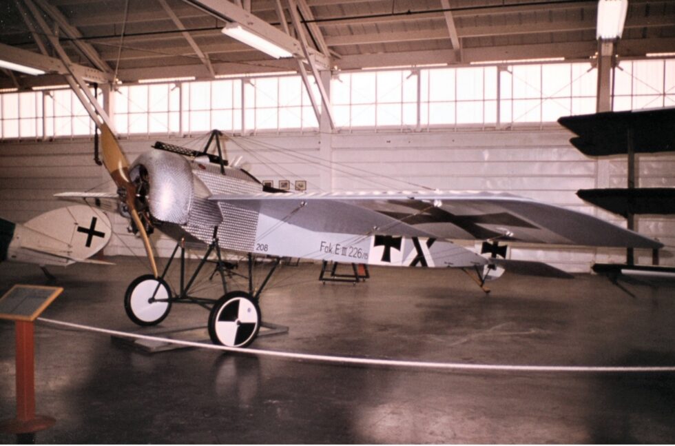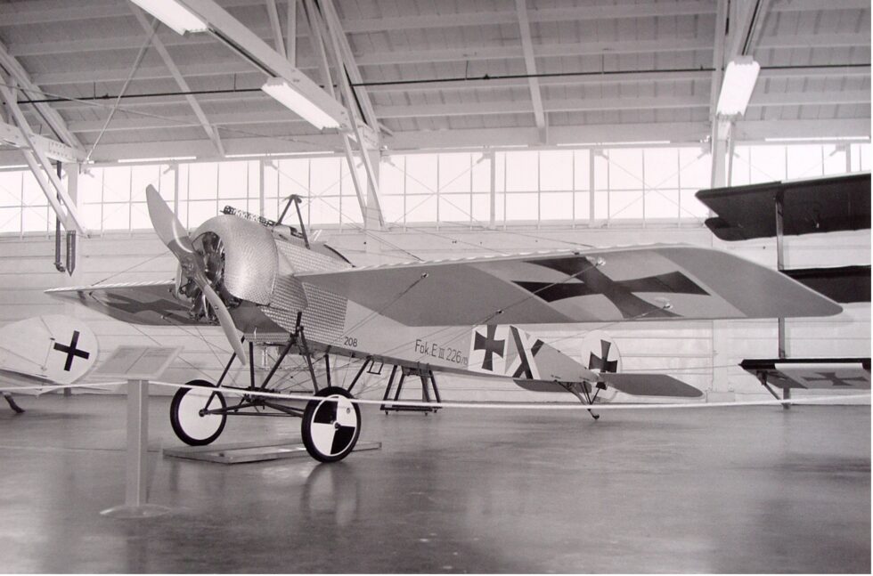 The E.III was a modified E.II model with larger, newly designed wings compared to the earlier Eindeckers, going back to Fokker’s original M.5 monoplane aircraft. The E.III retained the same 100 hp Oberursel U.I engine, had a larger 21.5 gallon drum-shaped main fuel tank just behind the cockpit, which increased the Eindecker’s endurance to about 2-1⁄2 hours, an hour more than the E.II. The aircraft was armed with a single .312 inch Spandau LMG 08 machine gun with 500 rounds of ammunition but some E.IIIs were fitted with twin guns.