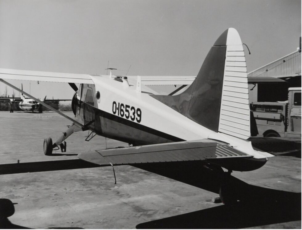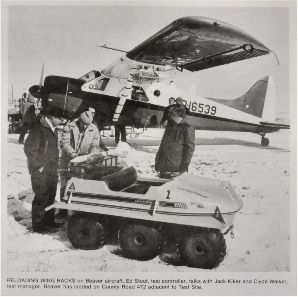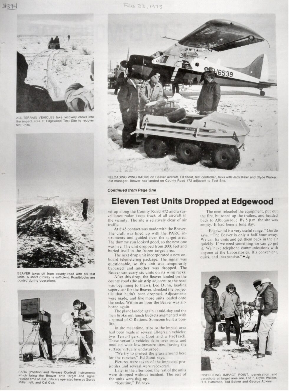 The Sandia National Laboratory (SNL) used a L-20A Beaver aircraft, 0-16539, to drop test devices to determine the depth of ice packs. The bomb shaped probes would impact the ice and send radio signals back to scientists so they can determine the depth. The experimental drops were made on the Moriarty Bombing Range in January of 1975.