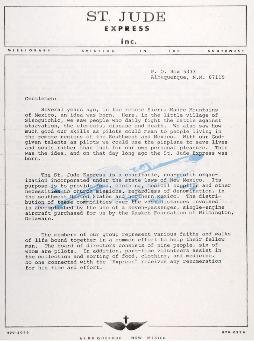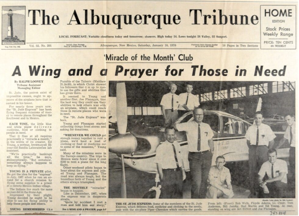 St. Jude Express was formed as a charitable, non-denominational non-profit organization in July of 1967 in Albuquerque, New Mexico. In 1968, St. Jude began flying missions of mercy to remote places throughout the Southwest and Mexico using the PA-32-300 Cherokee Six, N-4102R. With each flight the little blue and white plane delivered medicine, food, and clothing to people in need. Their operations covered New Mexico, western Texas, and northern Mexico and lasted until 2012.