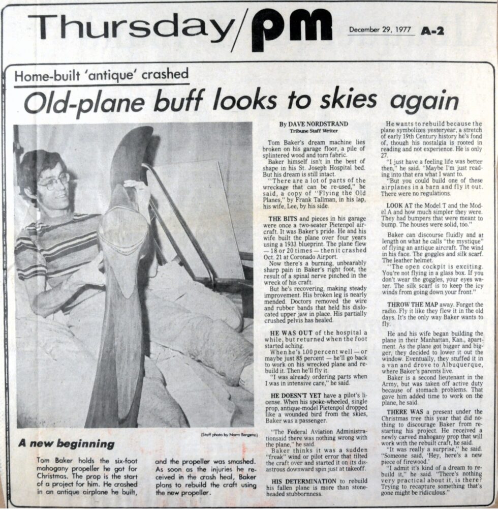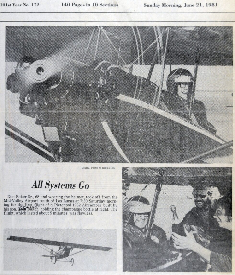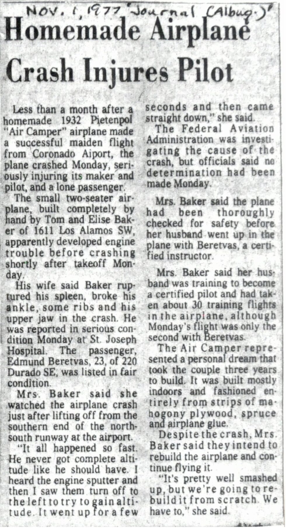 This Pietenpol Air Camper, N-8051-B, was a do-it-yourself kit from the 1930s. Albuquerque residents Tom and Elise Baker built this aircraft from a set of original plans in 1977. The aircraft crashed on its second flight from Albuquerque’s Coronado Airport injuring Tom. He later rebuilt the aircraft and flew in again on March 20, 1981.