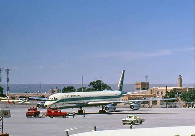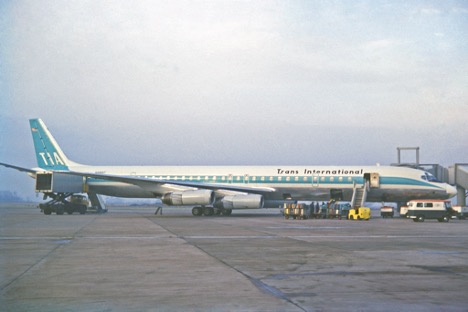 A Trans International Airlines Douglas DC-8-63 at Albuquerque in June, 1973.