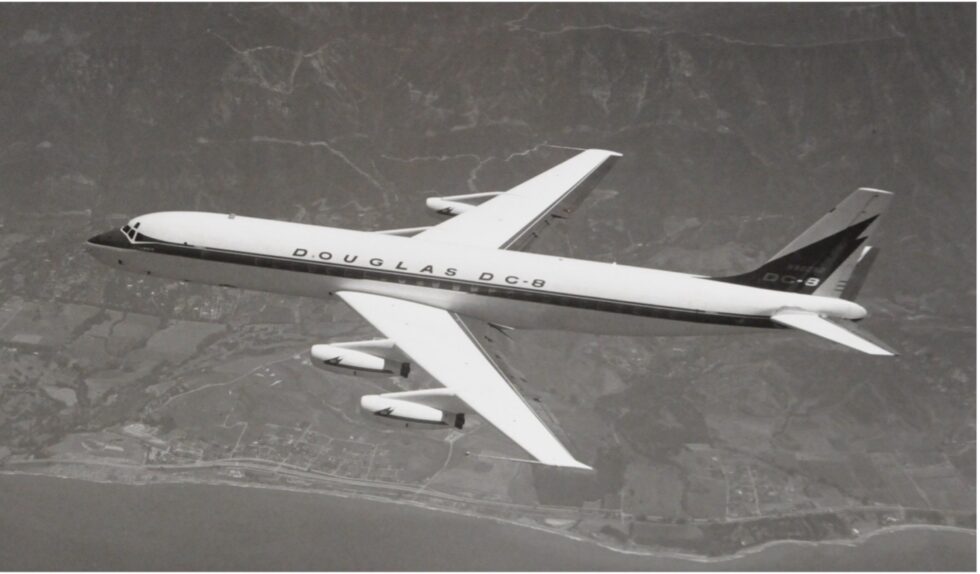 The Douglas DC-8 is an early long-range narrow-body jetliner designed and produced by the American Douglas Aircraft Company. Work began in 1952 for a jet-powered aerial refueling tanker for the US Air Force but after losing the tanker competition to the rival Boeing in May 1954, Douglas announced in June 1955 that their jetliner project will be marketed to civil operators as the DC-8. The first DC-8 was rolled out in Long Beach Airport on April 9, 1958, and flew for the first time on May 30. Following Federal Aviation Administration (FAA) certification in August 1959, the DC-8 entered service on September 18. The DC-8 was produced until 1972 with a total of 556 aircraft built. The DC-8 was replaced by the larger wide-body airliners including the Douglas DC-10. The DC-8 exited passenger service for good during the 1980s and 1990s but some DC-8s remain in use today as freighters.