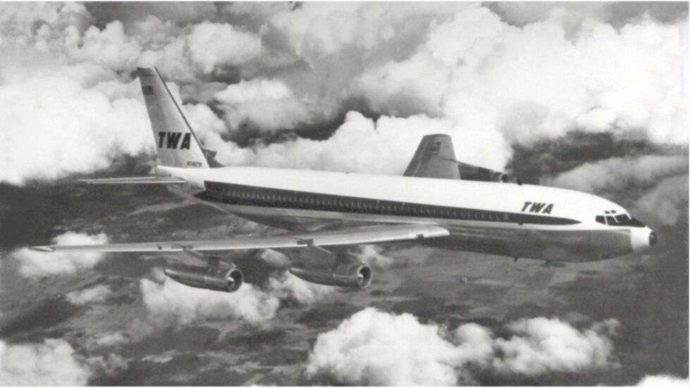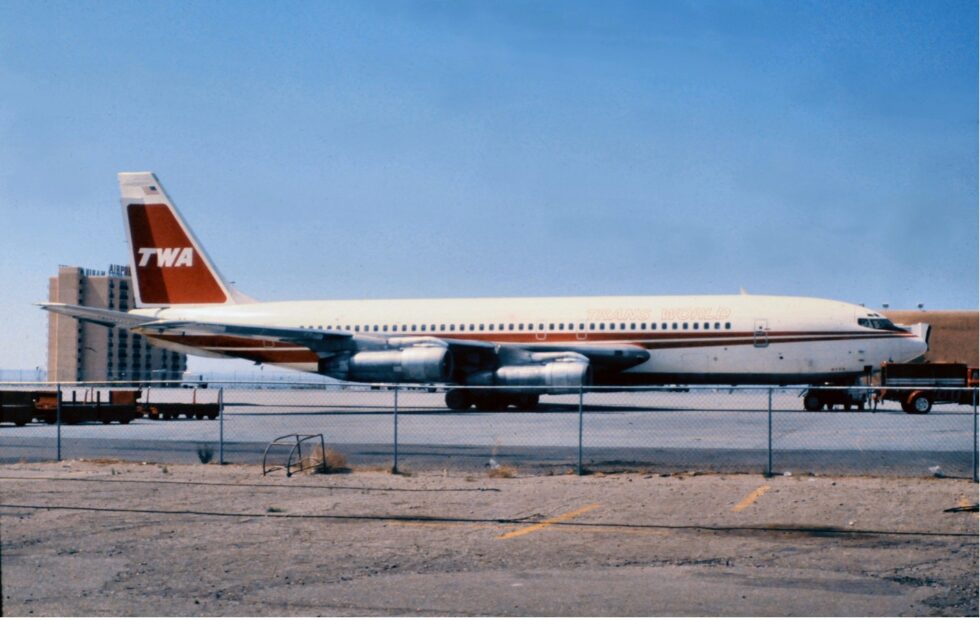 Seen below are two images with TWA’s original “arrow” liverly on the 707 followed by one image with the new “two-stripe” livery on an aircraft at the Albuquerque Sunport.