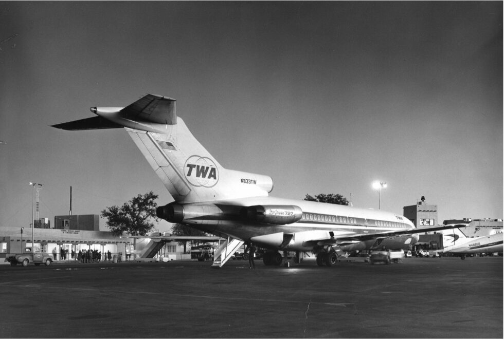 The black and white image below shows a TWA 727-100, N833TW, at the old terminal of the Albuquerque Sunport which was still in use when the 727 began service.