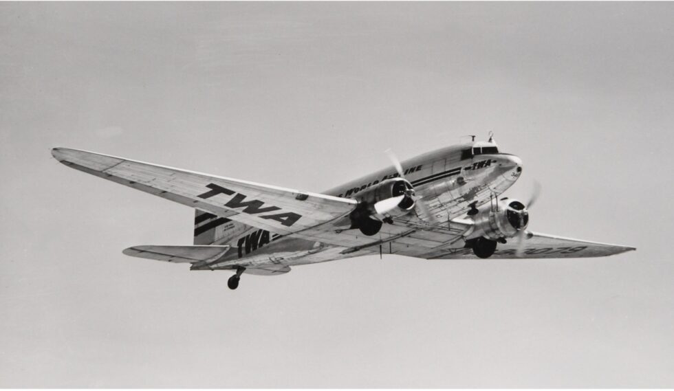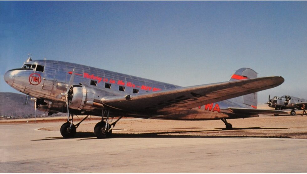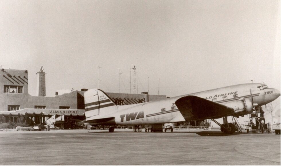 The Douglas DC-3 was flown by Transcontinental and Western Airlines, TWA, from 1937 until the mid 1950’s. The DC-3 began regular service to Albuquerque in 1937, supplementing and replacing its predecessor, the DC-2.The DC-2 and DC-3 would be the only aircraft TWA would fly during the World War II years of 1942 through 1945. Early versions of TWA’s aircraft carried the title “The Lindbergh Line” followed by “The Transcontinental Line”. TWA changed its name to Trans World Airline in 1946, keeping the TWA abbreviation, and two red stripes were painted on the fuselage of the aircraft along with a new logo that included an indian arrow. In the summer of 1946, TWA flew 34 flights per day through Albuquerque, 17 eastbound and 17 westbound. All were flown with DC-3’s and all were routed over TWA’s transcontinental route between Los Angeles and New York, stopping at Winslow, Arizona to the west and at Amarillo, Wichita, Kansas City, and many other cities to the east of Albuquerque. Service to Santa Fe, New Mexico was added to the route in 1948. The DC-3’s were replaced by larger Lockheed Constellation and Martin 404 aircraft by the mid-1950’s.