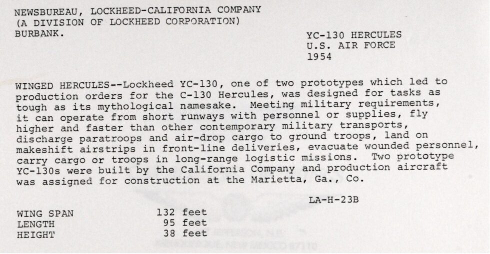 The Joint Task Force-2 based at Sandia Army Base used four of the specially equipped Hercules for evaluation of the low altitude penetration capability of several military aircraft beginning in 1965. Electronic equipment aboard these aircraft tracked the test aircraft and recorded flight path information. The C-130 aircraft documented at Sandia Base participating in JTF-2 include aircraft numbers 33387, 050022, 00299 and 60539.