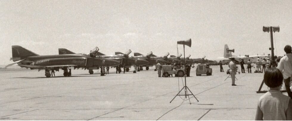 The McDonnell Douglas F-4 Phantom II was flown by the US Navy precision flying team, the Blue Angels. The aircraft began service with the Blue Angels on May 1, 1971. The F-4J Phantom II, Bu No. 153075 was seen at Kirtland Air Force Base in Albuquerque, New Mexico in May of 1974 as a transient aircraft and not part of the Blue Angels precision flying team demonstration.