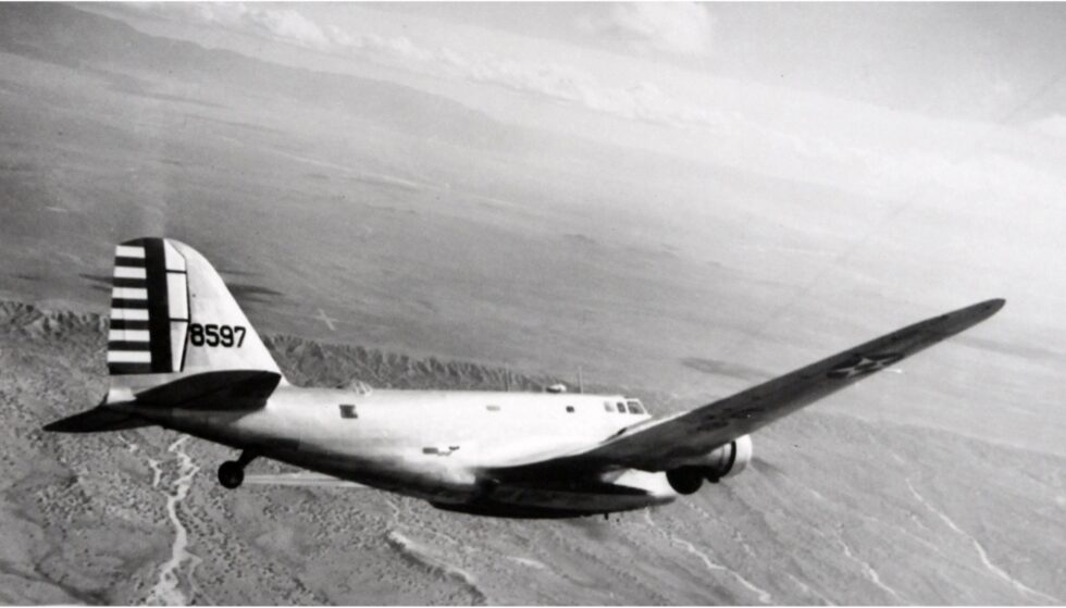 The B-18 aircraft with tail number 8597, the model on display, is seen banking towards Albuquerque’s Kirland Field in this undated photo.