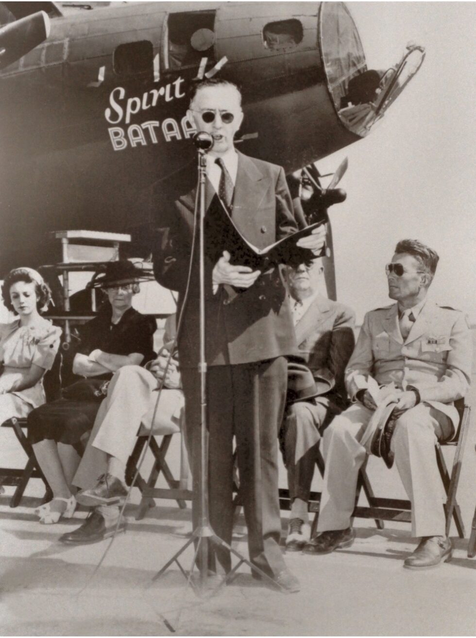 The special ceremony was held on July 11, 1943, at Kirtland Army Air Field with the B-17 that had the “Spirit of Bataan” painted on the nose to thank the people of Albuquerque for the successful bond drive.