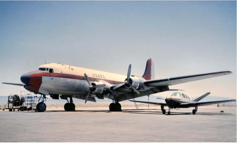 The Douglas C-54 “Skymaster” transport aircraft was used until 1975. The US Air Force version of the civilian airliner, the Douglas DC-4, was used by Ross Aviation as part of their contract with the United States Atomic Energy Commission (USAEC) beginning in 1971. The plane provided passenger and cargo support for Sandia and Los Alamos National Labs and was based at Kirtland Air Force Base.