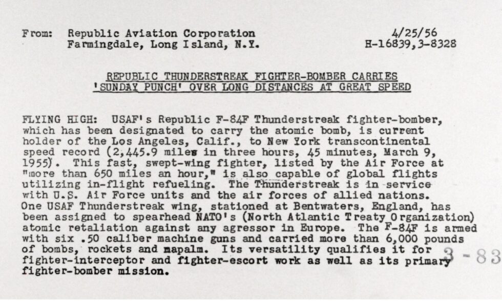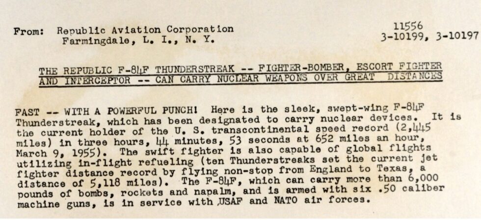 The Republic F-84F Thunderstreak was a swept-wing turbojet-powered fighter-bomber built by Republic Aviation in 1948. The RF-84F Thunderflash was the photo reconnaissance version of the aircraft. The Republic YRF-84F participated in two U.S. Air Force experimental programs during the development of the F-84F fighter-bomber and later testing of the “parasite” fighter concept.