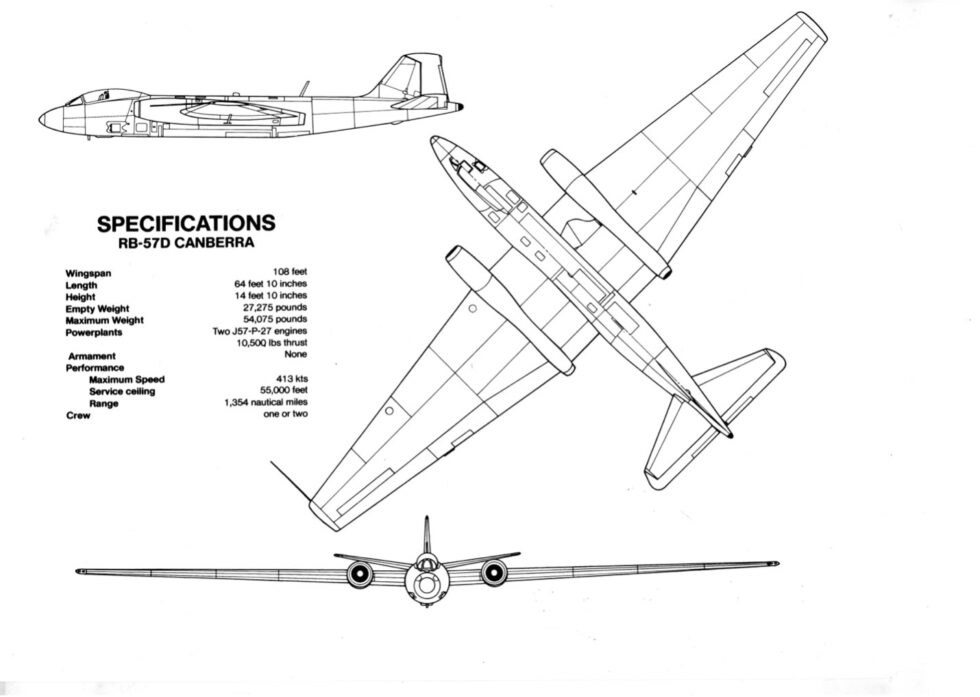 The basic B-57 Canberra design was used as a starting point for the D model but several significant changes were incorporated with the most obvious being the greatly enlarged wing. The wingspan of the B-57 was lengthened by 42 feet to a length of 106 feet overall. The chord of the wing was also increased, which combined with the increased length gave the wing a very high lift capability. The second major change to the RB-57D was the substitution of Pratt & Whitney J57 engines instead of the Wright J65 engines that were used on all earlier B-57 models. The J57 engines produced about 10,000 lb. of thrust each. Other significant changes to the D model included the removal of all fuselage fuel tanks along with the removal of all defensive armament and the bomb bay which was replaced by avionics equipment. There were 20 RB-57Ds built and they included four basic variants with each one having mission specific changes incorporated into the design. The first RB-57D flew on November 5, 1955 and the aircraft was active from 1957 until 1963.