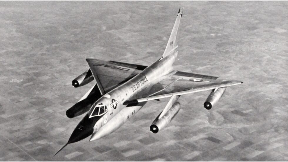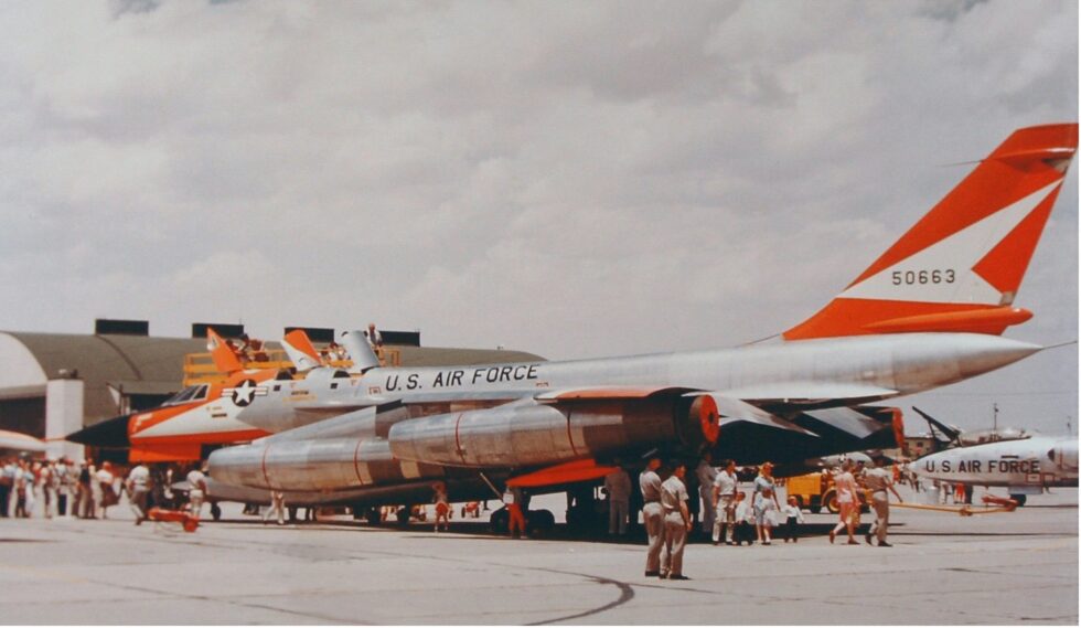 The Convair B-58, 50663, was given its “pod adaptation” trials at the Kirtland Air Force Base’s weapons center in 1963. This bomber was designed to deliver nuclear weapons at several times the speed of sound.