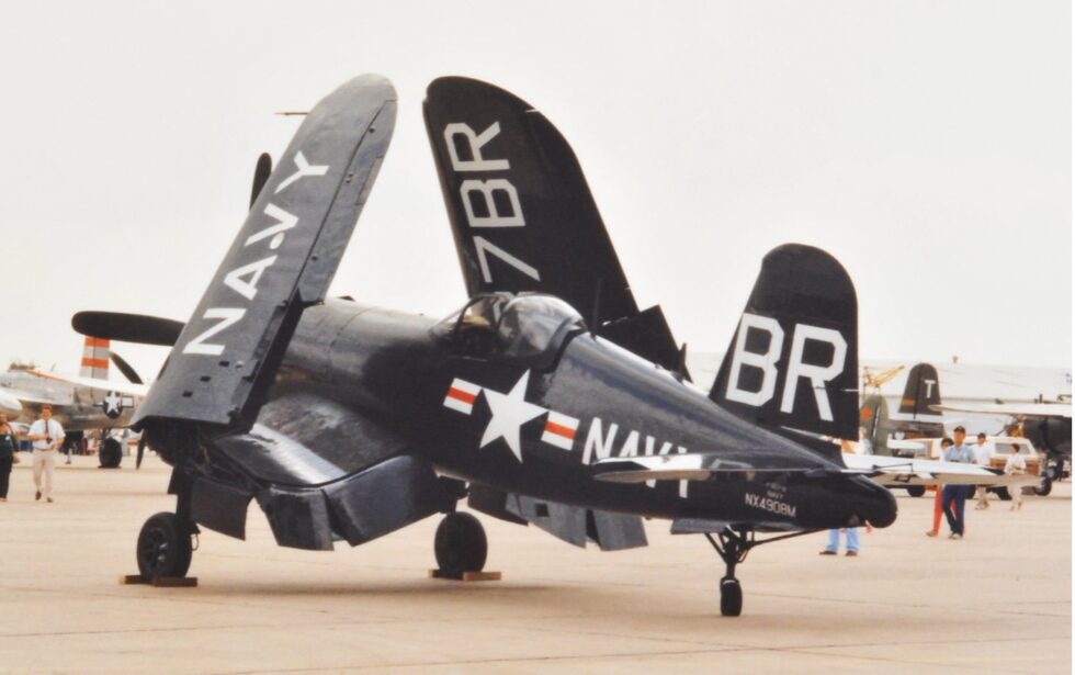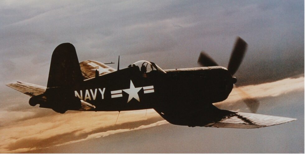 The Corsair was designed and operated as a carrier-based aircraft, and entered service in large numbers with the U.S. Navy in late 1944 and early 1945. It quickly became one of the most capable carrier-based fighter-bombers of World War II. Early problems with carrier landings and logistics led to it being eclipsed as the dominant carrier-based fighter by the Grumman F6F Hellcat, powered by the same Double Wasp engine first flown on the Corsair’s initial prototype in 1940. As a result, the Corsair’s early deployment was to the land-based squadrons of the U.S. Marine Corps and U.S. Navy. The Corsair served almost exclusively as a fighter-bomber throughout the Korean War and during the French colonial wars in Indochina and Algeria. This aircraft was one of the most successful fighters in WWII and Korea.