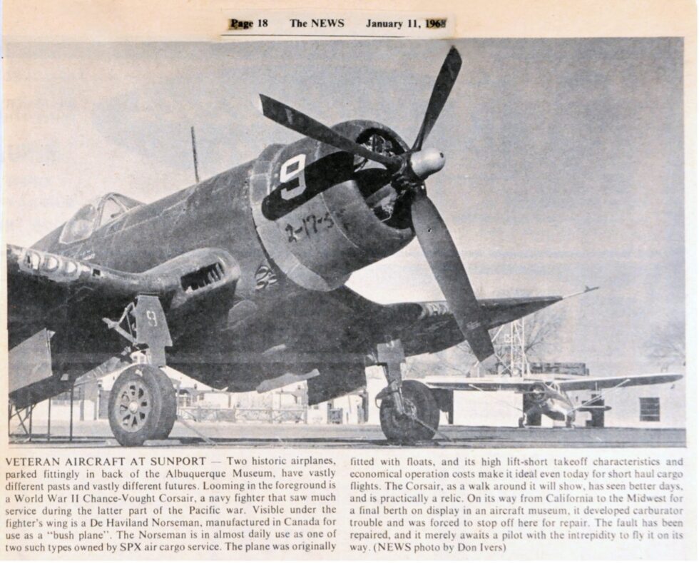 The first photo below is of a F4U Corsair that landed in Albuquerque on January 11, 1968 while on its way to California. The plane developed carburetor trouble and landed here for repairs. The plane was on the way to a museum to be restored. After repairs, the Corsair it flew on to its final designation. The plane below was a restored flying Corsair seen at the 1976 CAF air show in Harlingen, Texas.