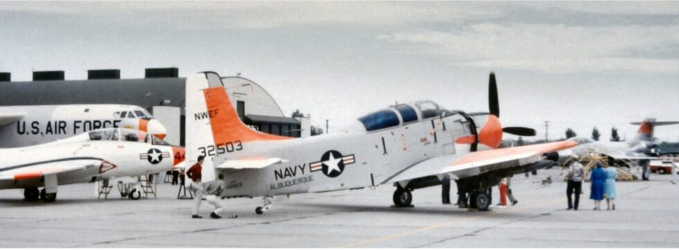 Many versions of the Skyraider were developed. The A-1E had a larger cockpit for side-by-side seating with another crewmember located behind the pilot. The early AD series only a single pilot onboard. The photo shows one of these aircraft assigned to Kirtland AFB.