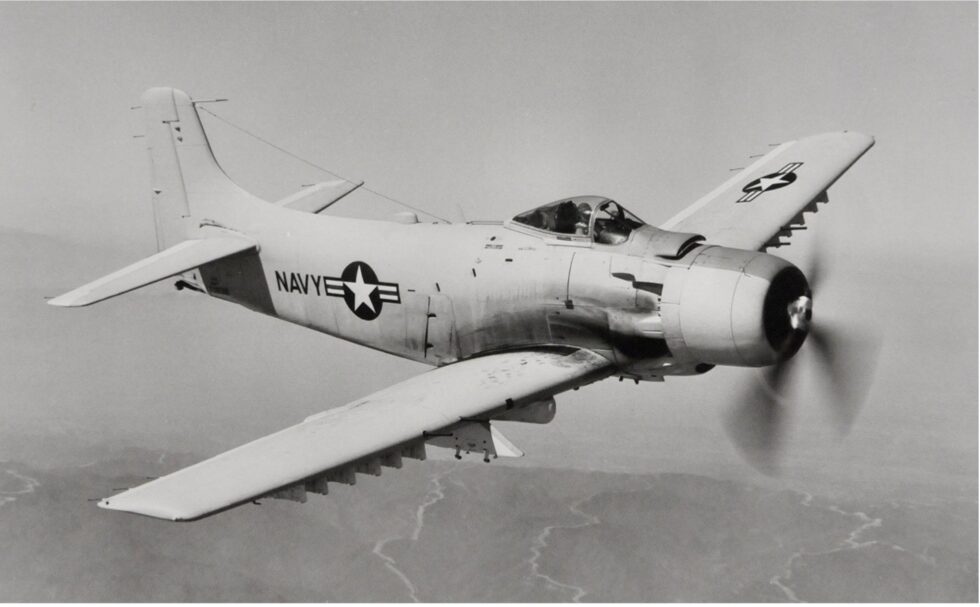 The Douglas A-1 “Skyraider” is an American single-seat attack aircraft in service from 1946 and served during both the Korean and Vietnam Wars. The Skyraider, formerly designated the AD-1 until 1962, had an unusually long career, remaining in front-line service well into the Jet Age. It was operated by the United States Navy, Marines, and Airforce. It remained in U.S. service until the early 1970s.