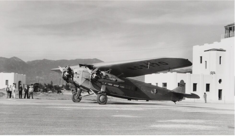 The Fokker F-10 Tri-Motor was an improved model over the Fokker F-7. Western Air Express, WAE, flew a proving flight in late 1928 and began its passenger service to Albuquerque on May 15, 1929 using the Fokker F-10. The route flown was between Los Angeles and Kansas City with stops at Albuquerque, Amarillo, Wichita, and several other cities. It was the first scheduled commercial airline service to Albuquerque. Several aircraft served Albuquerque including nubers NC445E, NC5170, NC279E, NC801E, NC215M and NE582. The model aircraft, N5170, flew the inaugural flight for WAE.